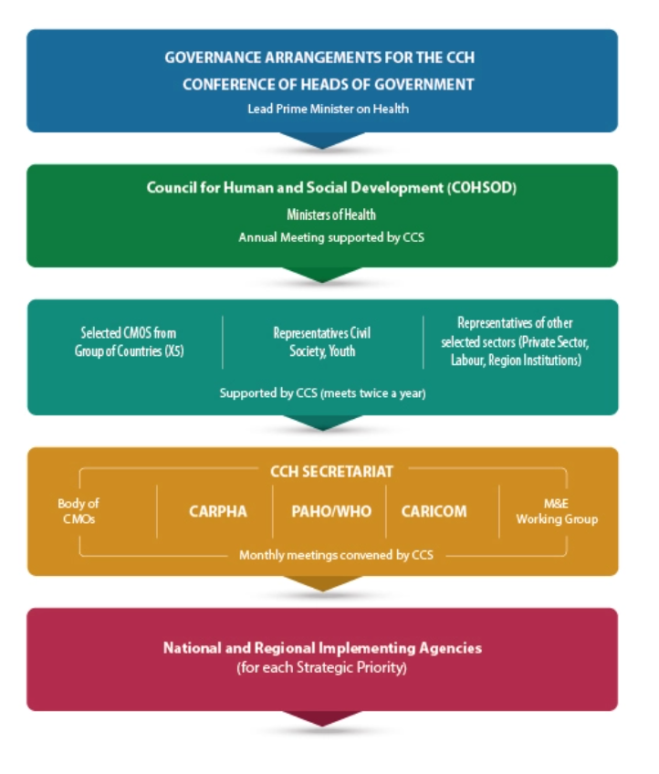 The governance structure for Caribbean Cooperation in Health (CCH) is designed to facilitate effective decision-making and action for an inter-governmental, multisectoral, multistakeholder and multiagency initiative. Given the intent of cooperation and collaboration in CCH, the structure addresses: